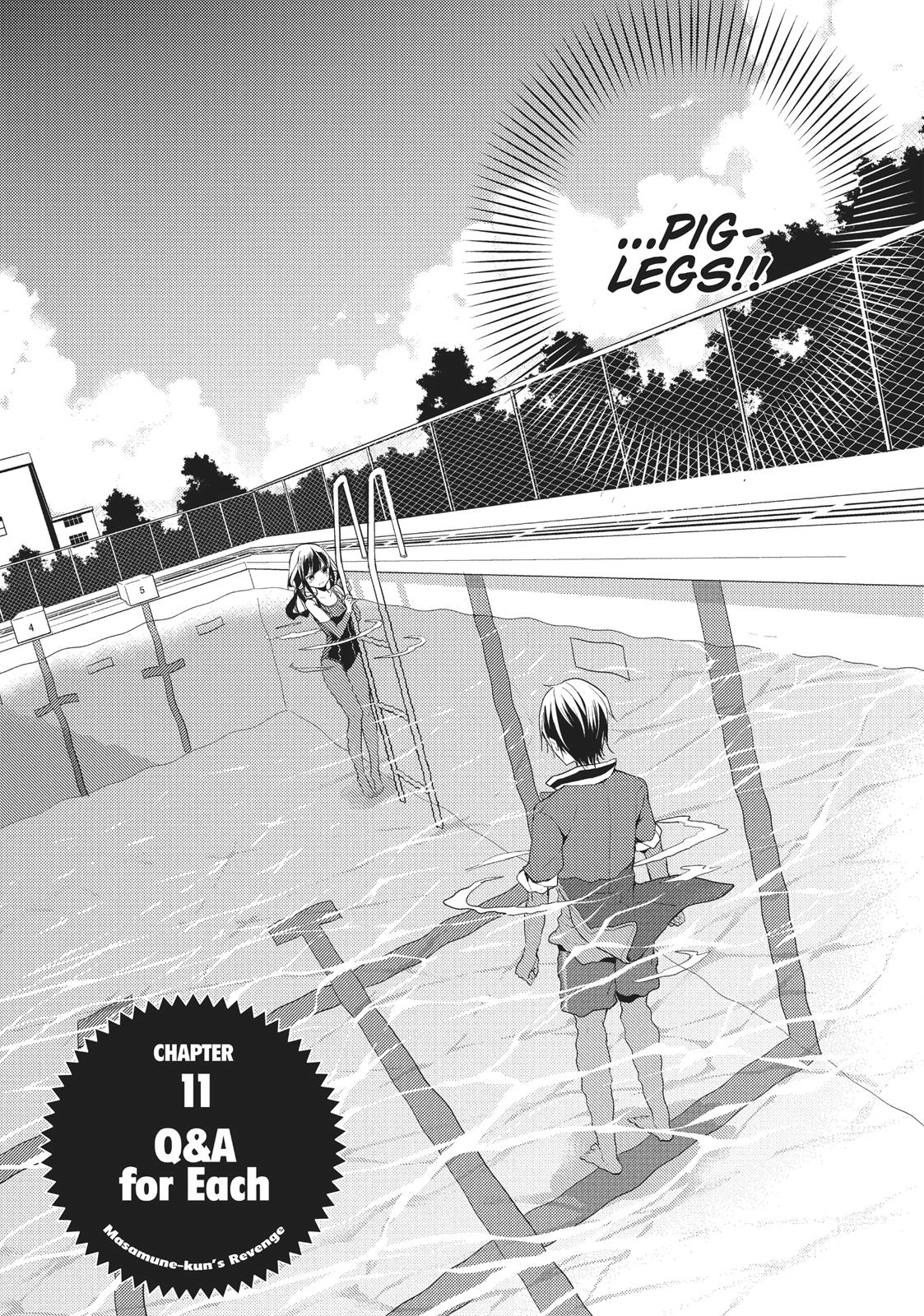Q&A for Each (TBA, TBA) is the eleventh chapter of the Masamune-kun no Revenge manga series, written by Hazuki Takeoka and illustrated by Tiv.